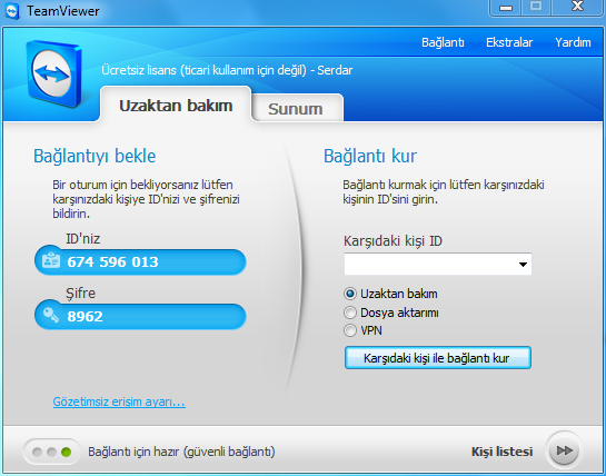 kolay ve güçlü bir uzak masaüstü yöneticisi, aynı zamanda masaüstü bilgileri paylaşım ve transfer yazılımıdır. Firewall ve NAT proxy'ye dokunmadan çalışabilme özelliği ile hiç bir sorun çıkarmadan istediğiniz herşeyi yapmanıza olanak sağlar. Sadece TeamViewer programı ile başka bir bilgisayarın uzak masaüstüne bağlanabilir ve bir makinede yüklü olan programı her hangi bir yükleme işlemine gerek kalmadan diğerinde de kullanabilirsiniz. Bağlanmak istediğiniz bilgisayara ilk defa bağlanacaksanız daha önceden belirlenmiş olan id numaralarını girmeniz gerekmektedir. TeamViewer'da ID numarasını ve şifreyi girdikten sonra uzak masaüstü erişimine sahip olursunuz. Dünyada yüzbinlerce insan TeamViewer'ı uzak masaüstü için en uygun, en kolay program olarak görüyor ve kullanıyor. TeamViewer sadece uzak masaüstü yönetimi için değil arkadaşınıza masaüstünüzde ne varsa onu da göstermeniz için geliştirilmiş bu tür kullanımlar için oldukça kolay bir arayüze sahiptir. Veri Özellikler: