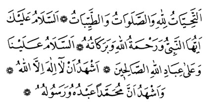 Dil ile, beden ve mal ile yapılan bütün ibadetler Allah'a dır. Ey Peygamber! Allah'ın selamı, rahmet ve bereketleri senin üzerine olsun. Selam bizim üzerimize ve Allah'ın bütün iyi kulları üzerine olsun. Şahitlik ederim ki, Allah'tan başka ilah yoktur. Yine şahitlik ederim ki, Muhammed, O'nun kulu ve Peygamberidir.