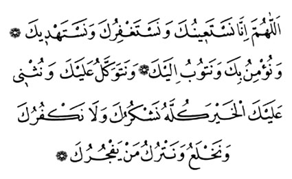 Allahım! Senden yardım isteriz, günahlarımızı bağışlamanı isteriz, razı olduğun şeylere hidayet etmeni isteriz. Sana inanırız, sana tevbe ederiz. Sana güveniriz. Bize verdiğin bütün nimetleri bilerek seni hayır ile öğeriz. Sana şükrederiz. Hiçbir nimetini inkar etmez ve onları başkasından bilmeyiz. Nimetlerini inkar eden ve sana karşı geleni bırakırız.